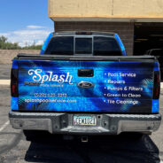 Fully wrapped truck for Splash Pools in Tucson, AZ. This is a new wrap we did for a Splash Pools truck using a printed water design to cover the whole truck. The design is a repeated pattern of water that was made to fit the size of the truck. After the correct print panel layouts were set up, it could then be printed. The prints are large vertical sections that get applied and detailed on the truck for a secure and clean fit. Each print will fit an area of the truck such as the sides, hood, tailgate. Detailing is important to get the...